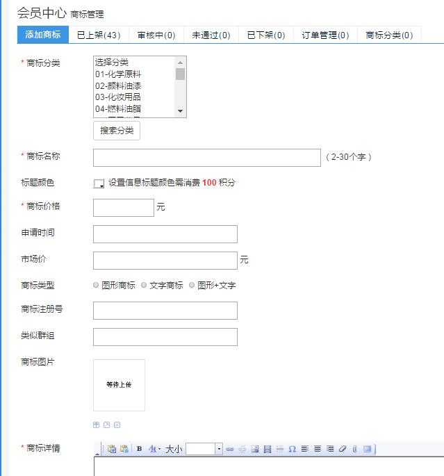 在此頁面可以根據(jù)自己實(shí)際情況,選擇要發(fā)布的商標(biāo)信息,包括:商標(biāo)類別、名稱、價格(包括出售價及市場價,市場價僅供買家參考)、申請時間、類型、注冊號、類似群組、圖片上傳以及簡要的文字說明,確認(rèn)無誤后即可點(diǎn)擊提交,待我們客服人員審核完畢后,即可在前臺出現(xiàn),成功上架。