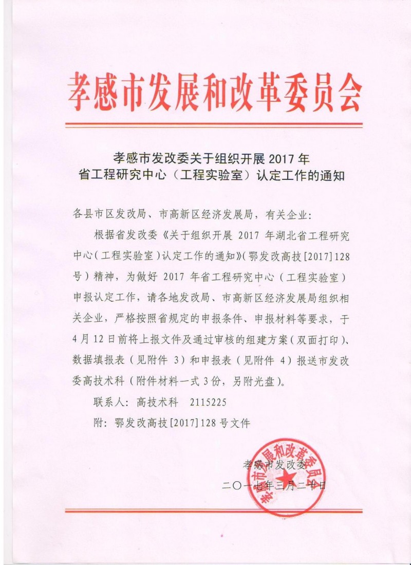 孝感市發(fā)改委關(guān)于組織開展2017年省工程研究中心(工程實驗室)認定工作的通知