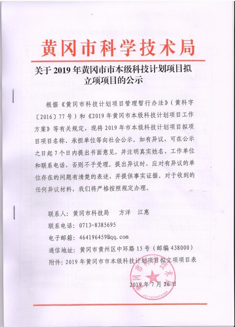 2019年黃岡市市本級(jí)科技計(jì)劃項(xiàng)目擬立項(xiàng)項(xiàng)目表