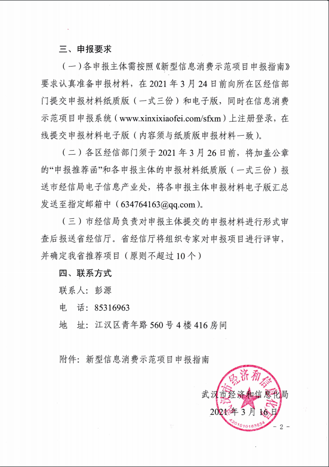 各申報(bào)企業(yè)需按照《新型信息消費(fèi)示范項(xiàng)目申報(bào)指南》要求認(rèn)真準(zhǔn)備申報(bào)材料,在2021年32317:00之前提交申報(bào)材料紙質(zhì)版(一式三份)至東湖高新區(qū)政務(wù)中心7號(hào)樓7016word電子版PDF蓋章版一并打包發(fā)送至郵箱1930171438@qq.com,同時(shí)在信息消費(fèi)示范項(xiàng)目申報(bào)系統(tǒng)(www.xinxixiaofei.com/sfxm)上注冊(cè)登錄,在線提交申報(bào)材料電子版(內(nèi)容須與紙質(zhì)版申報(bào)材料一致)。